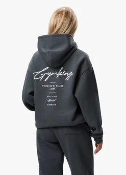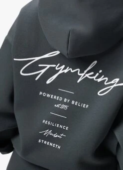 - ‘GYM KING, POWERED BY BELIEF, EST. 2015, RESILIENCE, MINDSET, STRENGTH’ print on back, in white