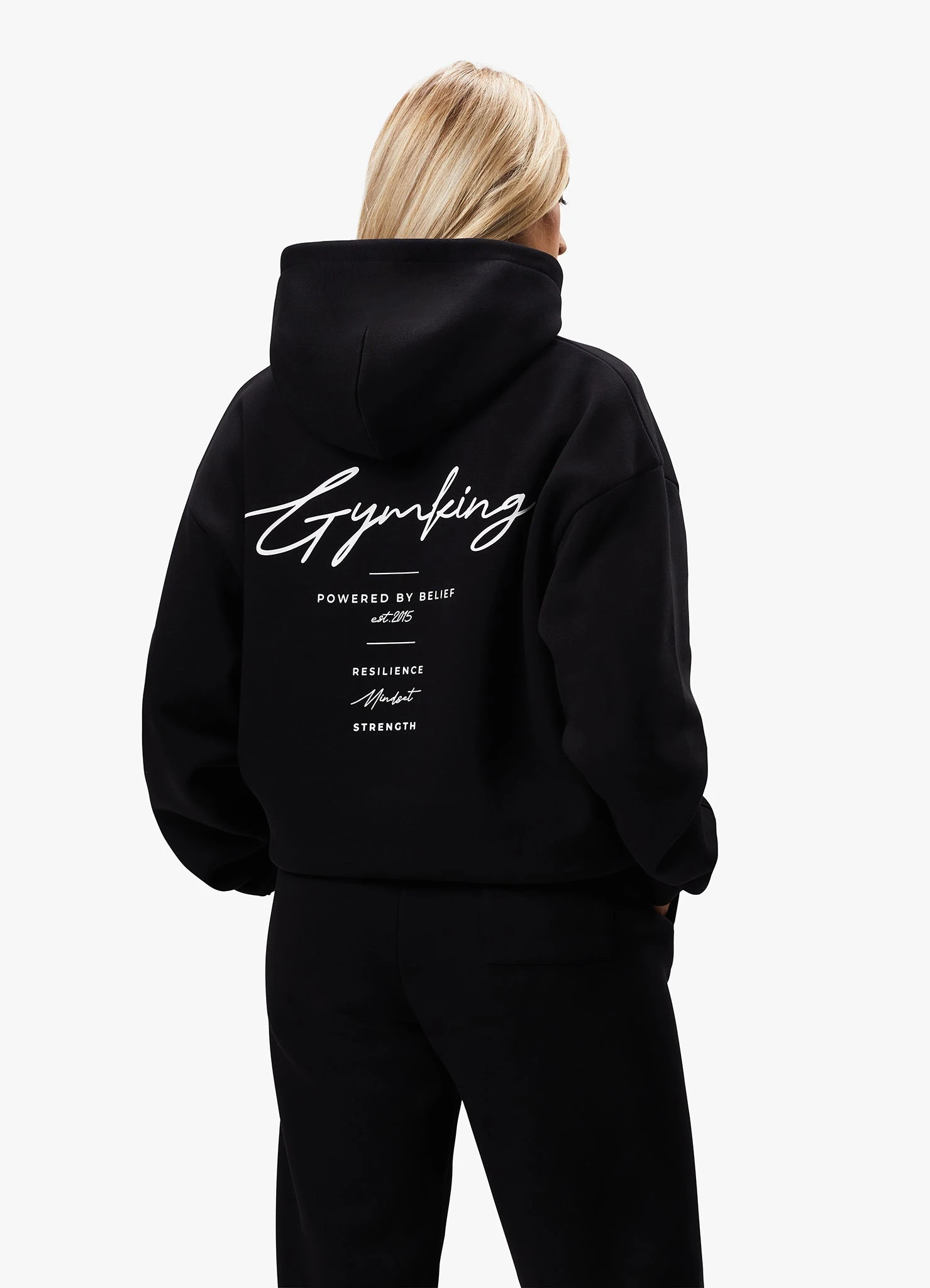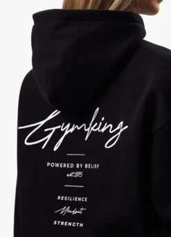 - ‘GYM KING, POWERED BY BELIEF, EST. 2015, RESILIENCE, MINDSET, STRENGTH’ print on back, in white